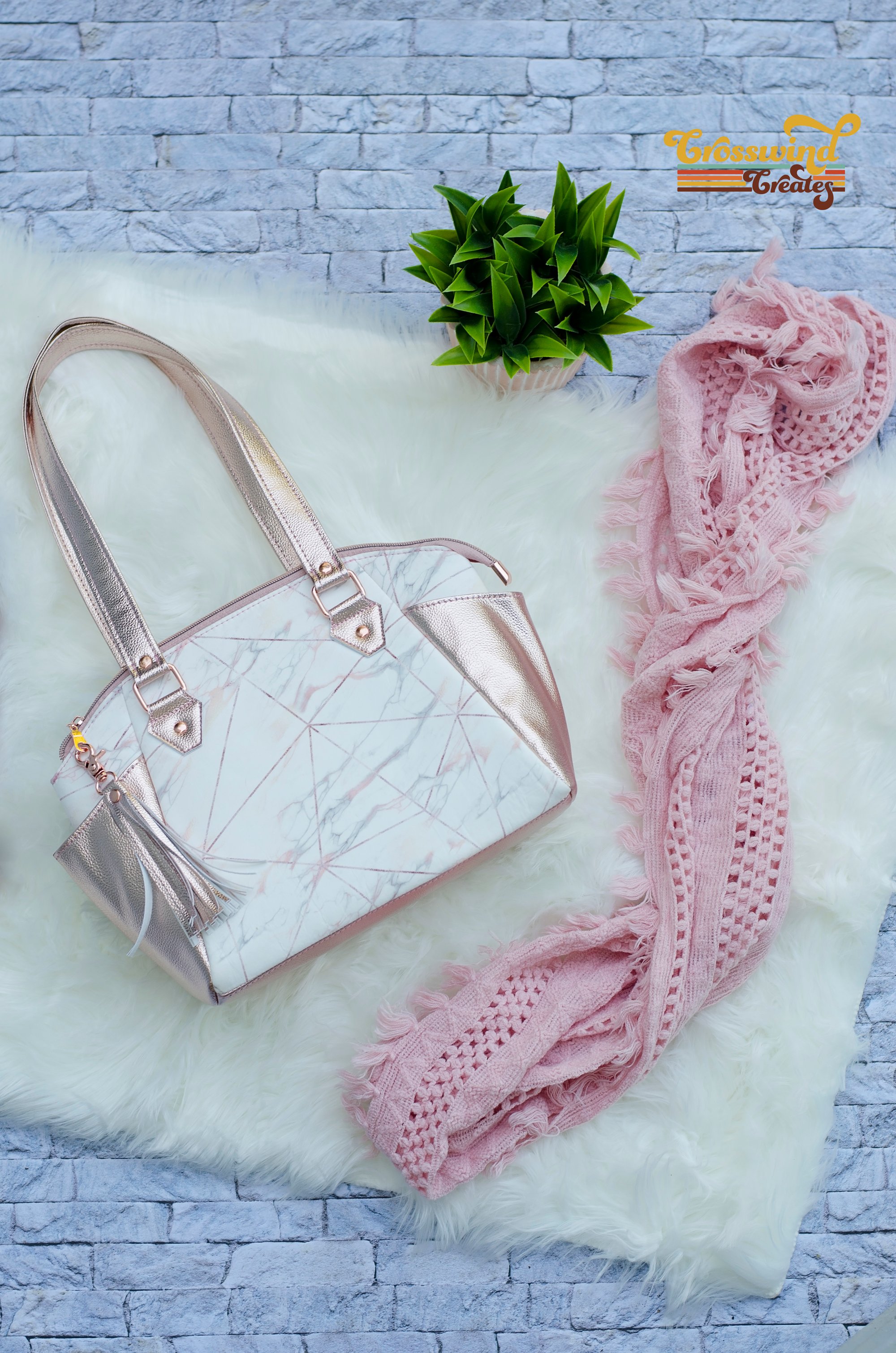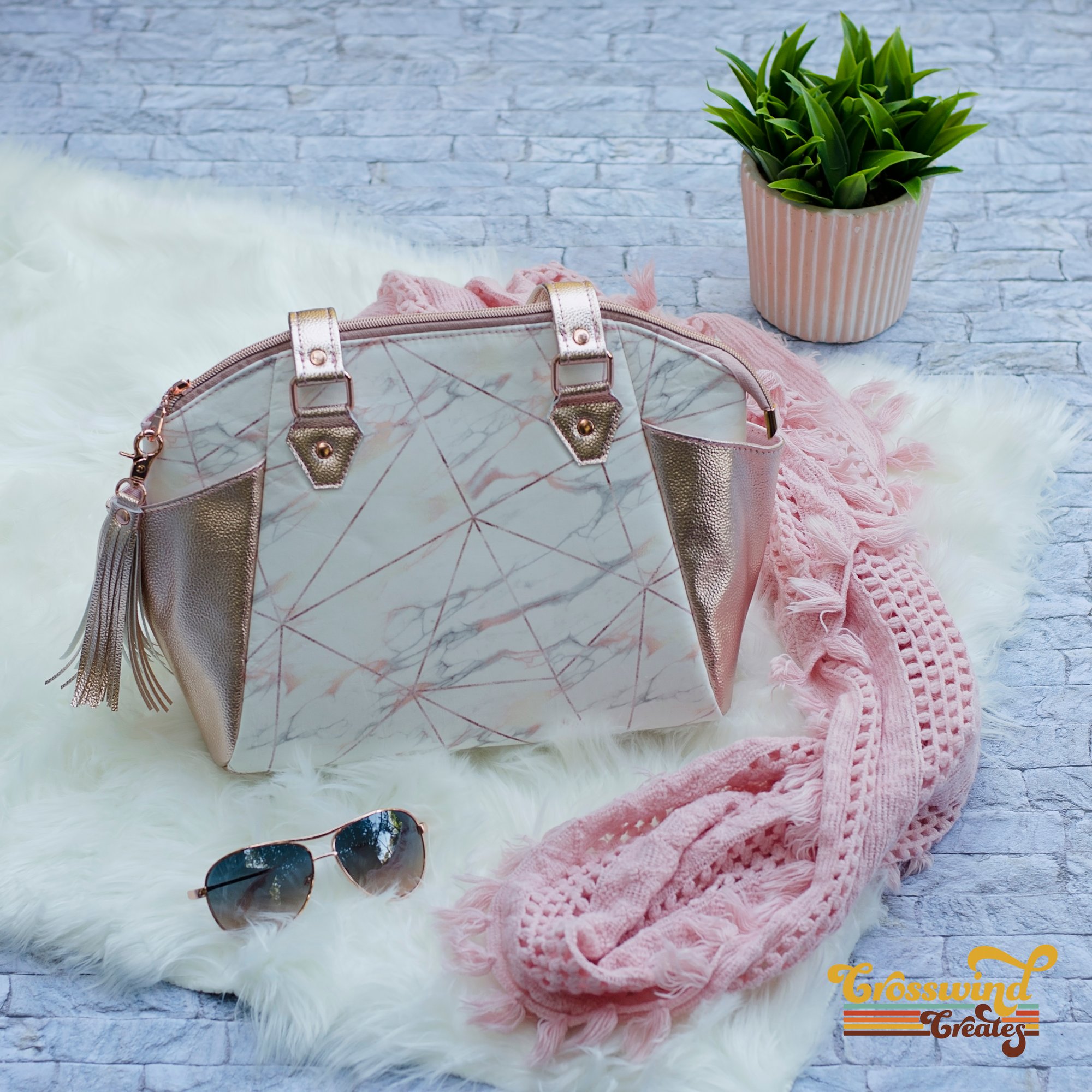Rose gold and marble coordinate for an elegant satchel! Sewn with custom fabric, and metallic rose gold vinyl and featuring rose gold finish hardware. Bag has two outer saddle pockets, a top zip closure and interior zip and slip pockets. Bag measures 13in wide x 9in tall x 5in deep.