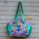 Look at this thing, isn't it neat? Sewn with custom fabric, and metallic bubble vinyl. Bag has two outer saddle pockets, a top zip closure and interior zip and slip pockets. Bag measures 13in wide x 9in tall x 5in deep.