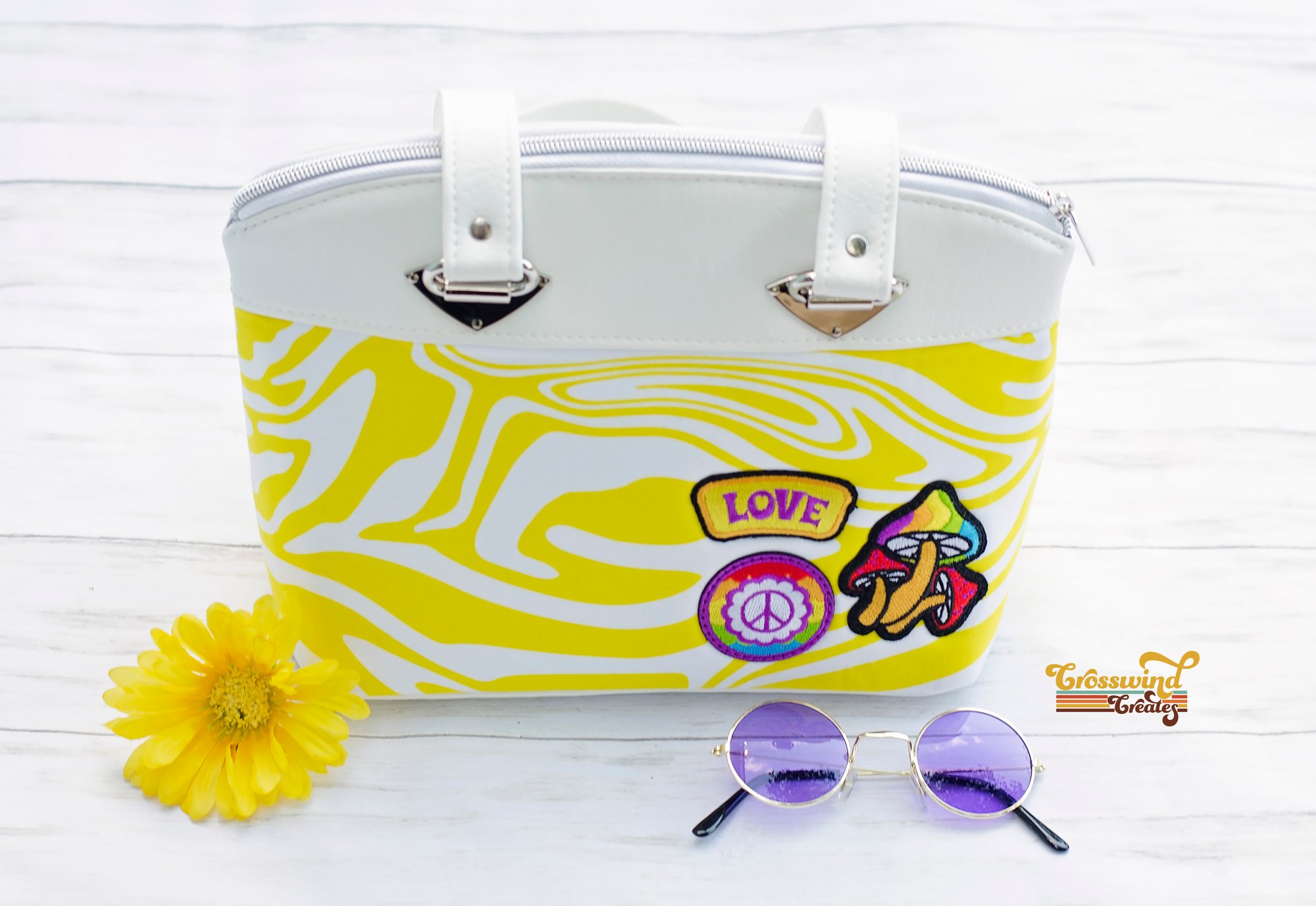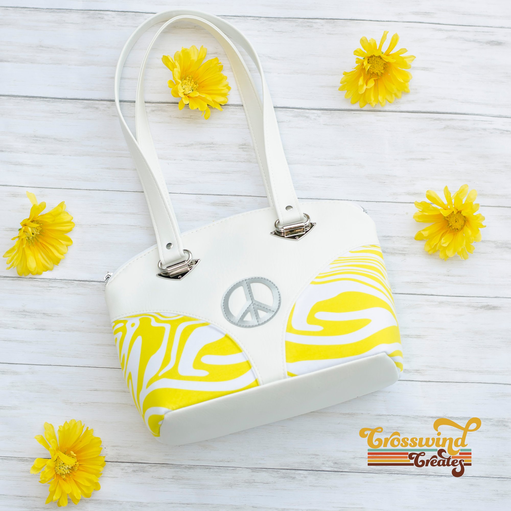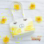 Totally groovy dome bag! Sewn from custom fabric and marine vinyls with an applique emblem and metal strap connectors with an easy access interior slip pocket. The bag measures 12″ wide, 8″ tall, and 6″ deep. Also features groovy embroidery appliques on the rear!